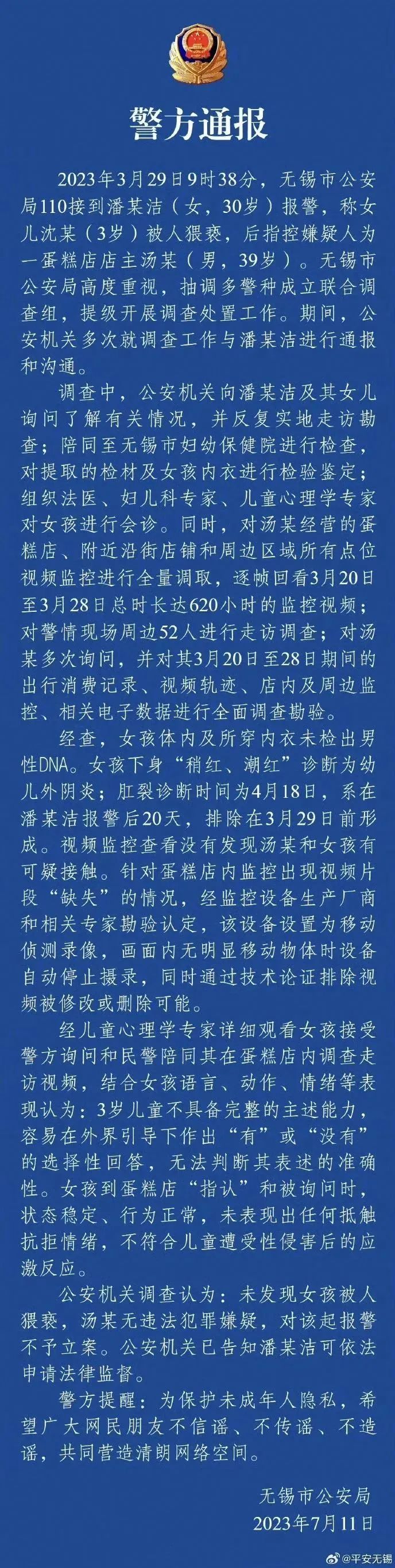 面對巨大的輿情壓力,7月11日,無錫市公安局發(fā)布通報(bào),詳述調(diào)查過程,包括DNA檢測、肛裂原因排除、視頻監(jiān)控核查、心理學(xué)家判定等內(nèi)容。通報(bào)全文800余字,邏輯清晰、內(nèi)容詳實(shí),“不存在猥褻行為”這一結(jié)論獲得輿論認(rèn)可,“#警方通報(bào)無錫3歲女童事件調(diào)查結(jié)果#”等微博話題閱讀量累計(jì)近6億。至此,輿情反轉(zhuǎn),多數(shù)網(wǎng)民指責(zé)潘某潔虛構(gòu)事實(shí)、利用女兒造謠污蔑,呼吁依法對其嚴(yán)懲。