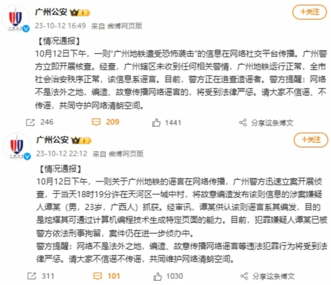 【典型案例】10月12日下午,一則“廣州地鐵遭受恐怖襲擊”的信息在網(wǎng)絡(luò)社交平臺(tái)傳播。此則消息以截圖的形式被傳播,圖片顯示作者為“廣州市公安局”,內(nèi)容稱“10月12日下午14時(shí),廣州市地鐵3號(hào)線珠江新城站,3名恐怖分子攜帶TNT炸藥在地鐵搶劫,走火發(fā)生意外,產(chǎn)生劇烈爆炸,造成多方傷亡”。當(dāng)日16時(shí)49分,官方微博“@廣州公安”發(fā)布通報(bào)進(jìn)行辟謠。同日22時(shí)12分,“@廣州公安”再次發(fā)布通報(bào)稱,當(dāng)天18時(shí)19分許在天河區(qū)一城中村,警方將故意編造發(fā)布該則信息的涉案嫌疑人譚某抓獲。經(jīng)審訊,譚某供認(rèn)該則謠言系其編發(fā),目的是炫耀其可通過計(jì)算機(jī)編程技術(shù)生成特定頁面的能力。