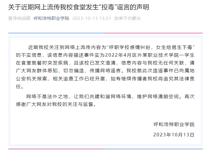 【典型案例】自10月初,連續(xù)有網(wǎng)民在社交媒體發(fā)視頻稱,呼和浩特職業(yè)學(xué)院發(fā)生悲劇,一名男生因感情糾紛被女生下毒致死,引發(fā)社會(huì)關(guān)注。10月13日,該校發(fā)布了一份聲明,澄清這條信息不實(shí),與學(xué)校無任何關(guān)聯(lián)。據(jù)悉,網(wǎng)絡(luò)流傳的視頻中描述的事件實(shí)為2022年4月江蘇南京交通職業(yè)技術(shù)學(xué)院一學(xué)生在食堂就餐時(shí)突發(fā)疾病 ,并非因?yàn)榕露尽6?,江蘇南京交通職業(yè)技術(shù)學(xué)院在當(dāng)時(shí)就已經(jīng)發(fā)布了相關(guān)澄清。再如,10月18日,網(wǎng)傳江蘇南京有男子在酒吧外性侵一名醉酒女子。當(dāng)日,事發(fā)地所屬南京市警方相關(guān)工作人員回應(yīng)稱,警方已查清此事,沒有性侵,網(wǎng)傳情況有夸大成分。另據(jù)警方透露,某社交網(wǎng)站流傳的不實(shí)消息,“是專門的AI軟件寫的”。
