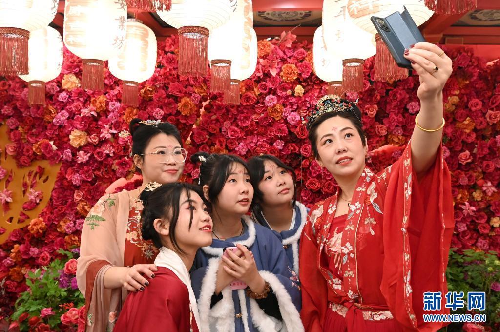游客身著漢服在西安“長(zhǎng)安十二時(shí)辰”沉浸式唐風(fēng)市井生活街區(qū)內(nèi)留影。新華社記者 劉瀟 攝