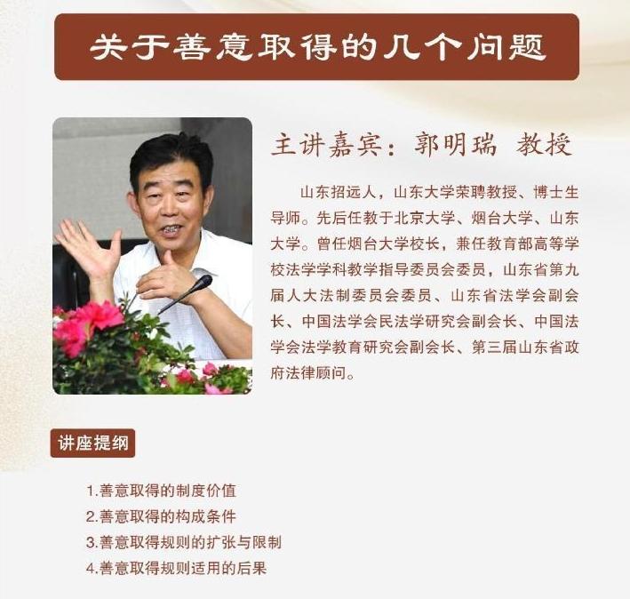 中國(guó)石油大學(xué)(華東)第八期 “石大人文講壇”邀請(qǐng)中國(guó)法學(xué)會(huì)民法學(xué)研究會(huì)副會(huì)長(zhǎng),煙臺(tái)大學(xué)原校長(zhǎng)郭明瑞教授圍繞“關(guān)于善意取得的幾個(gè)問(wèn)題”,將于4月15日在中國(guó)石油大學(xué)(華東)逸夫樓一樓報(bào)告廳開(kāi)講。