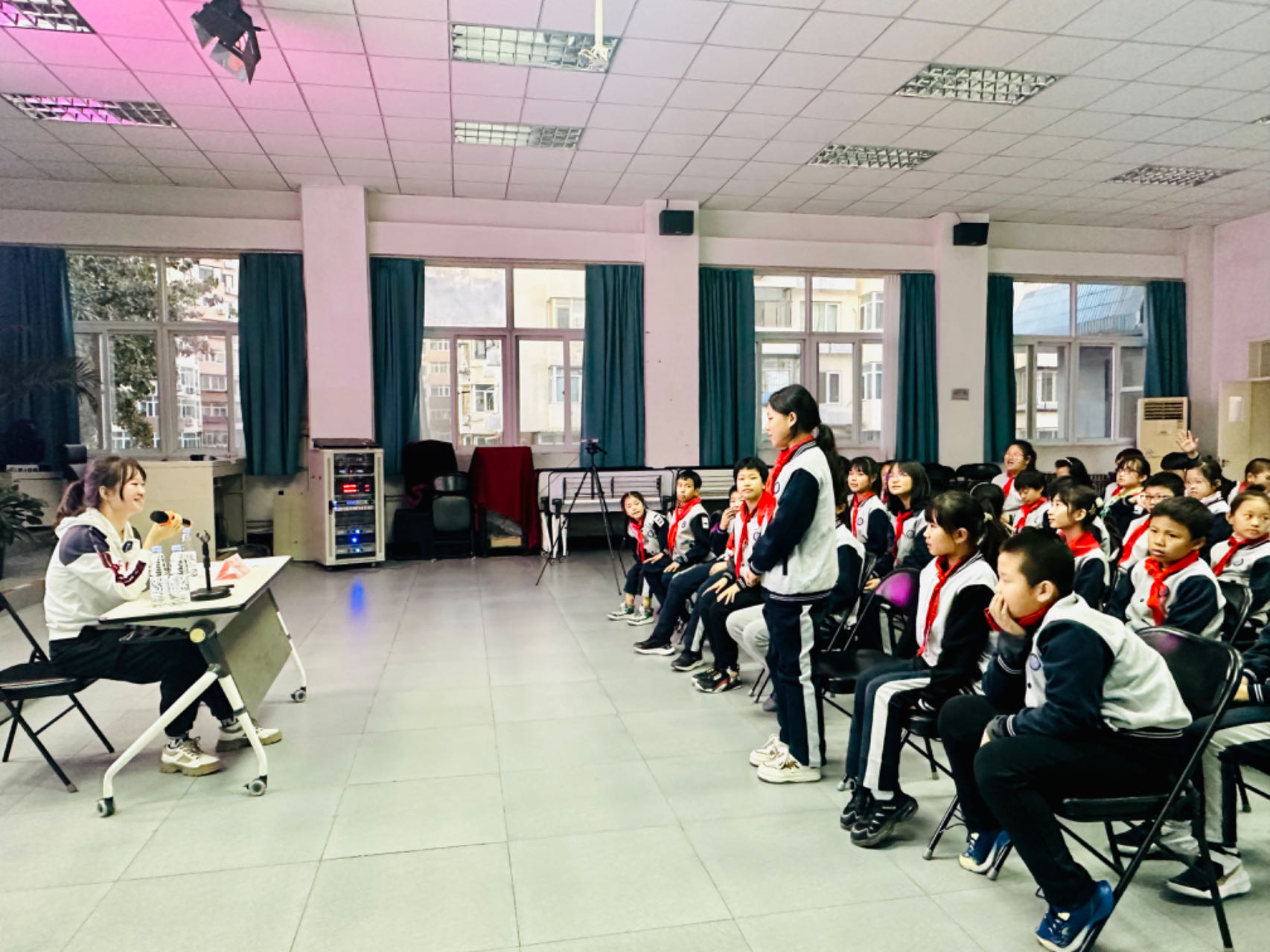北京大學法學院丁葉萱與北京市朝陽區(qū)芳草地國際學校甘露園分校小學部甘露校區(qū)學生進行法律知識座談會。