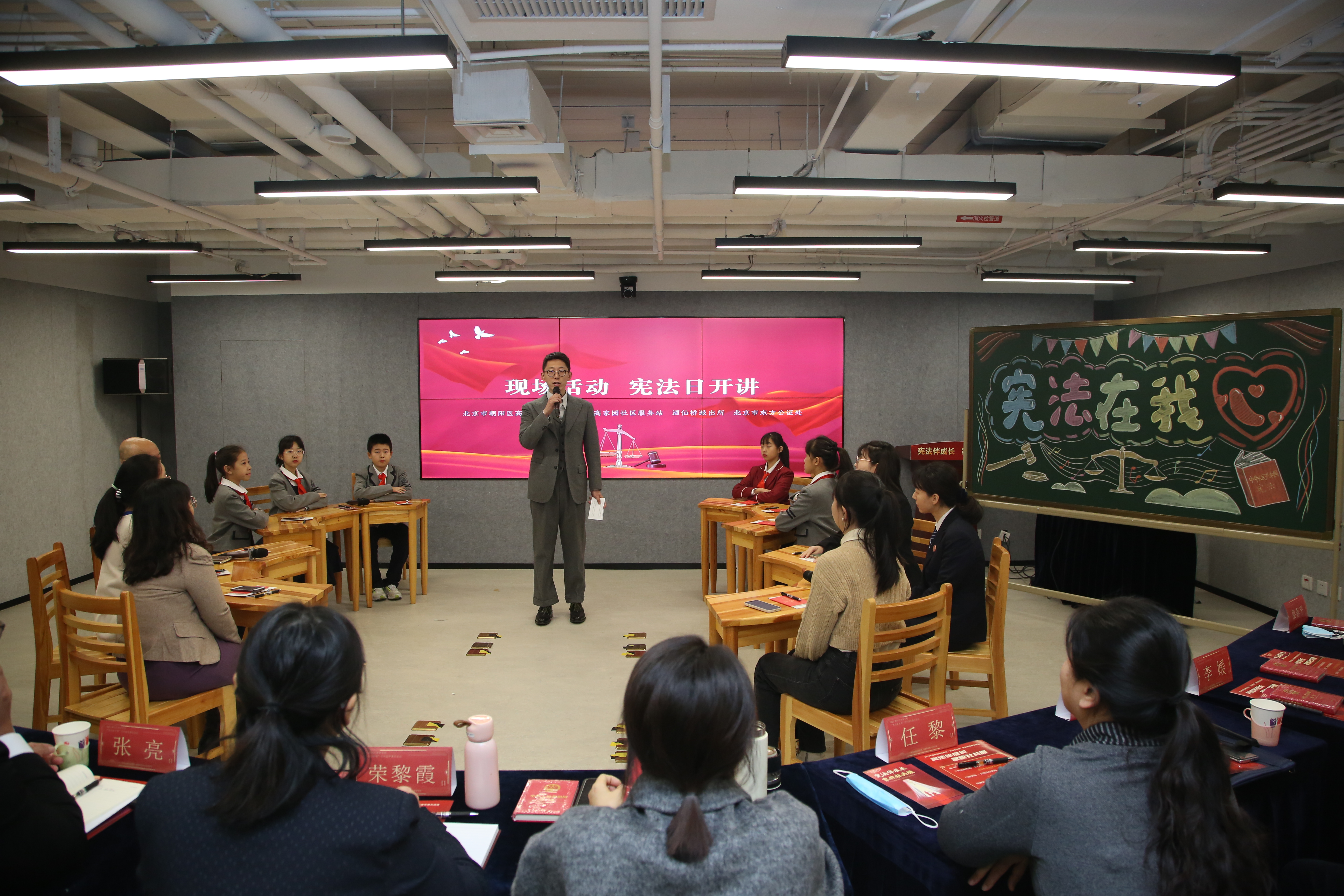 12月3日,北京市朝陽區(qū)高家園小學與將臺路小學及社區(qū)聯(lián)手,共同舉辦了“憲法伴成長 家校社共振”主題現(xiàn)場活動。高家園小學張弜老師帶領大家走進憲法“講堂”。