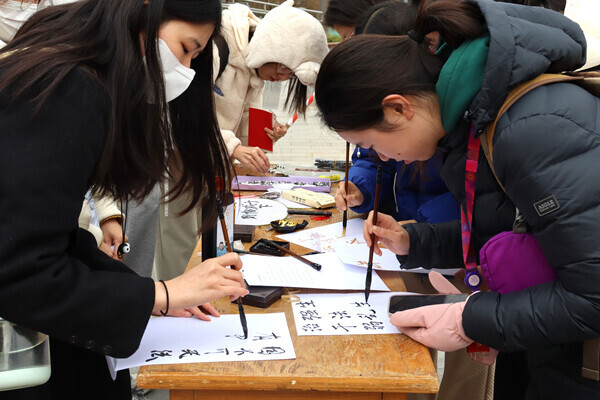 同一天,主題活動(dòng)在清華大學(xué)學(xué)生服務(wù)中心前舉辦?;顒?dòng)通過(guò)限時(shí)背誦憲法名言、法律知識(shí)問(wèn)答等游戲方式,向師生普及憲法,引導(dǎo)學(xué)習(xí)憲法?,F(xiàn)場(chǎng)設(shè)計(jì)了“想點(diǎn)大事”“三行情書”“與法同行”“現(xiàn)身‘書法’”等活動(dòng),鼓勵(lì)師生們以筆書寫憲法意,以心感悟憲法情?,F(xiàn)場(chǎng)還準(zhǔn)備了帶有宣傳法治內(nèi)容的小夜燈、筆記本、卡套、文件夾等文創(chuàng)獎(jiǎng)品。