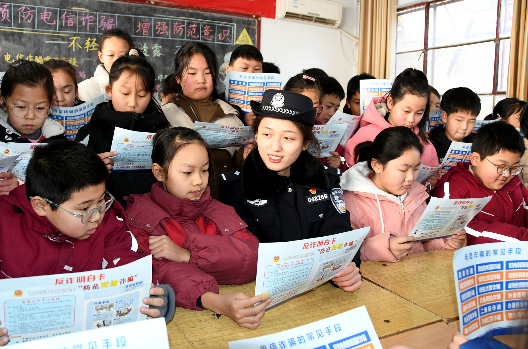 圖為1月22日,民警在實驗小學為同學們講解防范電信詐騙知識。