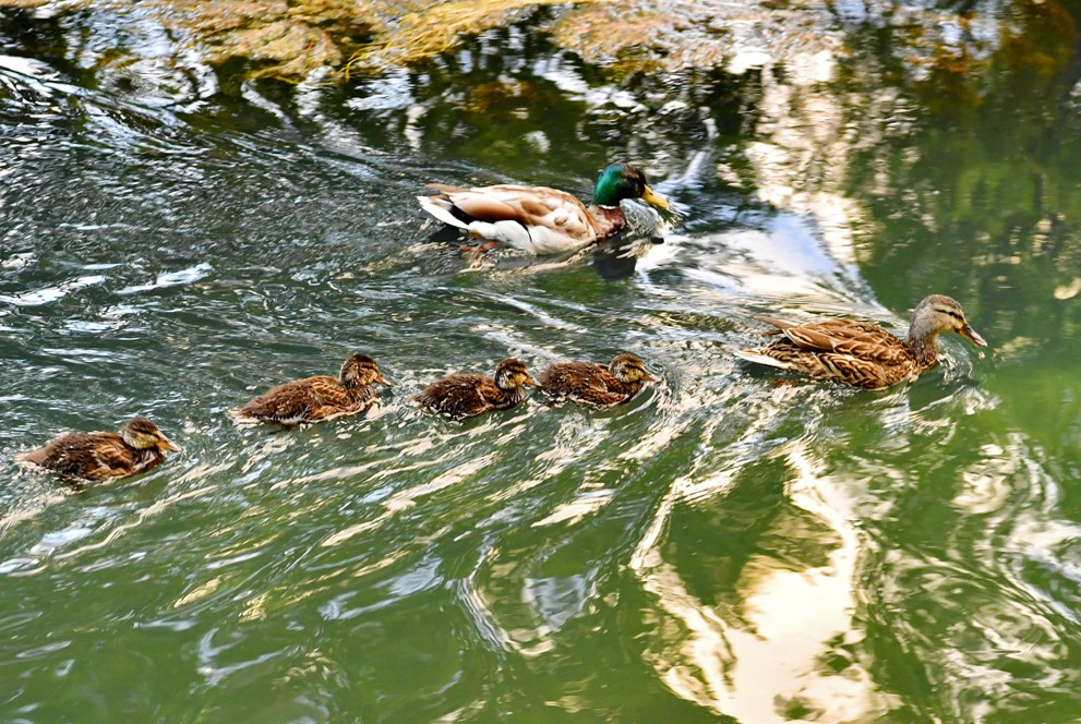 一對(duì)成年綠頭鴨帶著小鴨在拉魯濕地游動(dòng)(5月27日攝)。